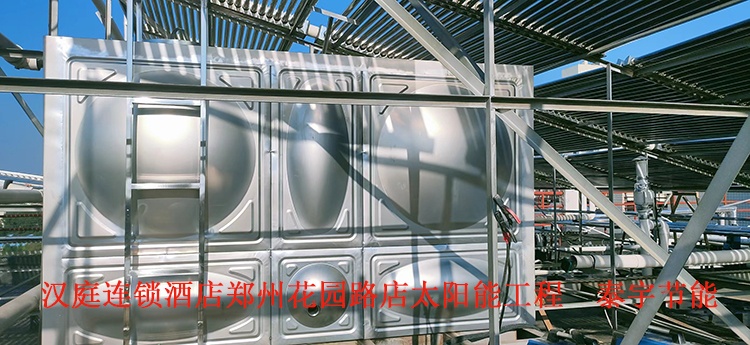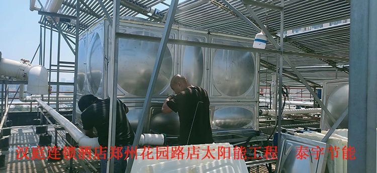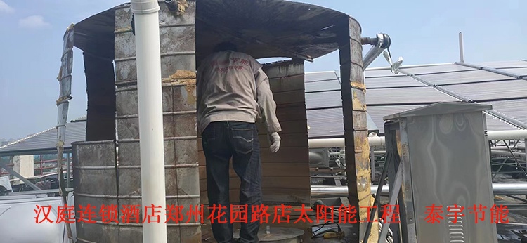 漢庭連鎖酒店鄭州花園路店太陽能保溫水箱更換中。該太陽能熱水工程已運(yùn)行12年之久,舊的圓水箱由于漏水已下崗,新的方水箱已上任。整個(gè)太陽能系統(tǒng)運(yùn)行12年之久,太陽能完好,水箱基礎(chǔ)完好,保溫水箱更換后,一切運(yùn)行正常。