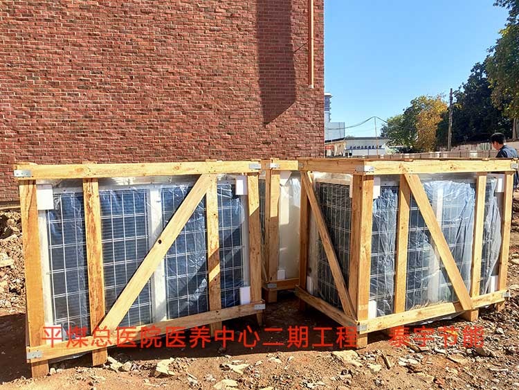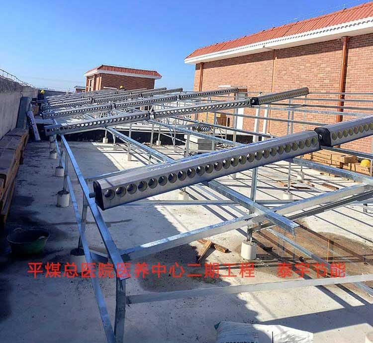 平煤總醫(yī)院醫(yī)養(yǎng)中心二期太陽能熱泵熱水項目共有兩棟樓康復(fù)樓及醫(yī)養(yǎng)樓??祻?fù)樓病房100多間,醫(yī)養(yǎng)樓病房200多間,兩棟樓日用熱水量約為60T,采用空氣能熱泵機組7臺,太陽能集熱面積約為4000平方左右,日產(chǎn)熱水量約為60T/日。