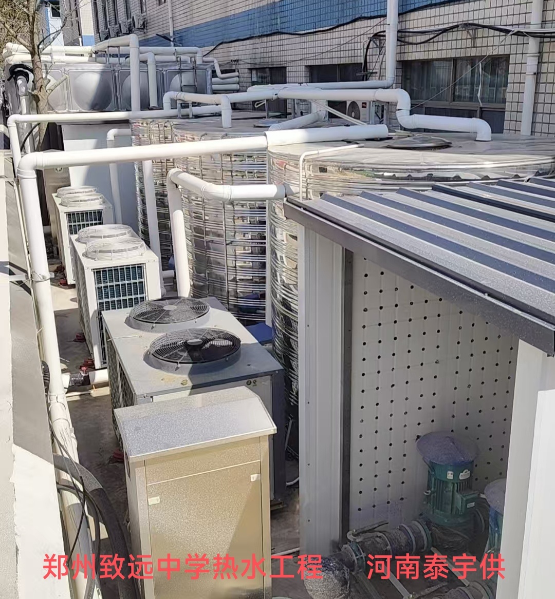 鄭州經(jīng)開區(qū)第五大街致遠(yuǎn)中學(xué)東校區(qū)太陽能空氣能熱水項(xiàng)目。太陽能空氣能熱水項(xiàng)目主要是滿足2000多學(xué)生洗浴及餐廳熱水所需。該熱水系統(tǒng)采用太陽能集熱器共計(jì)面積約200平方,采用空氣能熱泵10P機(jī)組3臺,日產(chǎn)熱水量不低于30T/日。